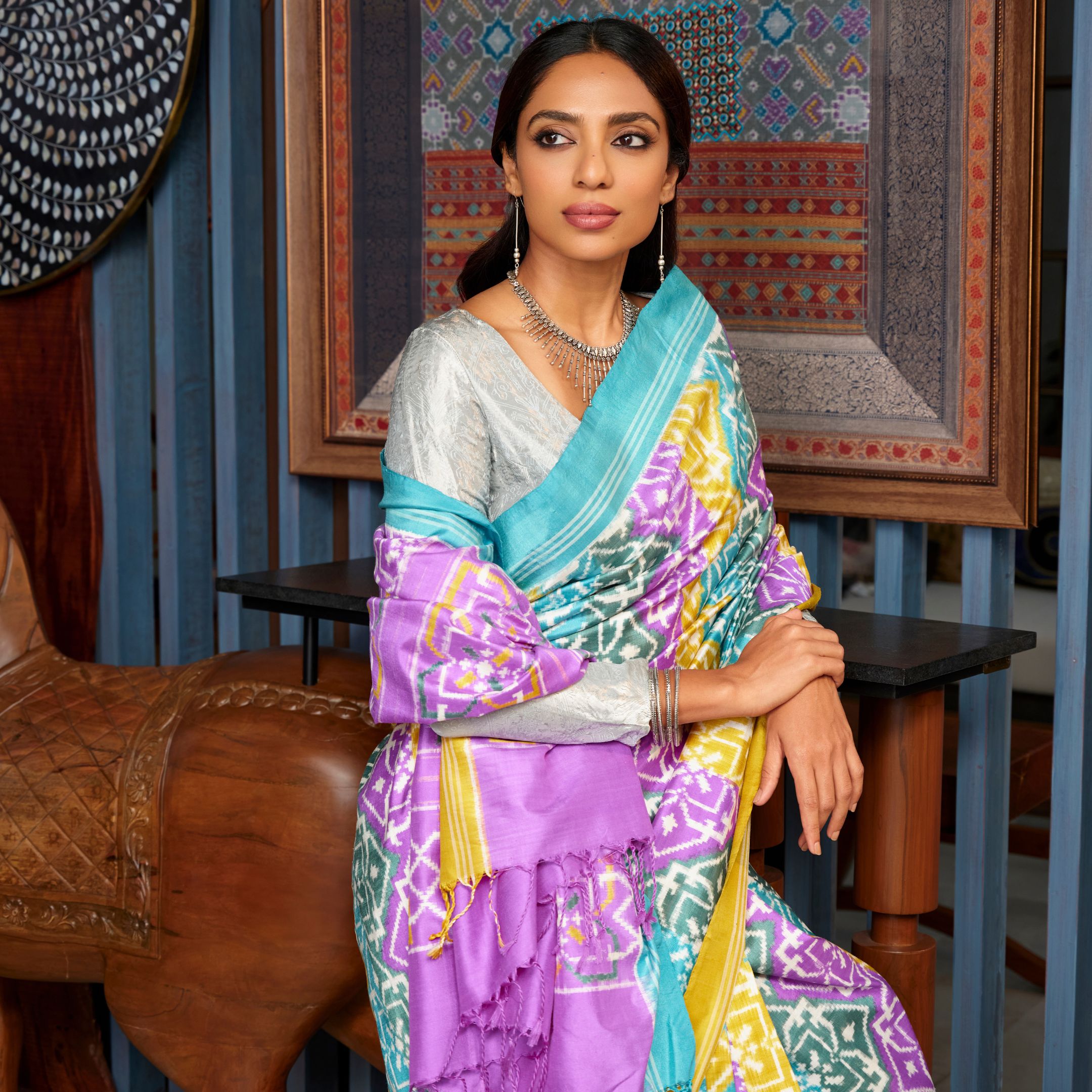 The actor wears a natural dyed Ikat sari by Aadyam Handwoven
